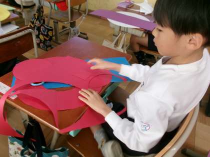 図工の学習で、「すてきなぼうし」作りをしています。今日は、ぼうしの形に色画用紙を切りました。自分だけのすてきなぼうしを完成させたいです。