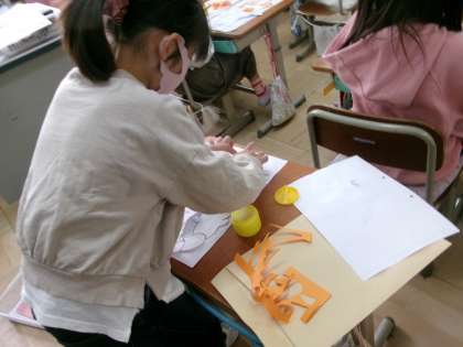 版画に向けての準備をしています。今日は、版画の土台作りの練習をしました。紙を重ねることで表したいことを表現することができることを学びました。慣れてからはどんどん形を仕上げていくことができていました。