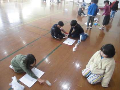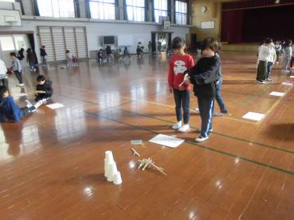身の回りの廃材を使ってのおもちゃ。いろいろな工夫がしてあって、1年生みんなはとても楽しくたくさんのおもちゃで遊ぶことができました。