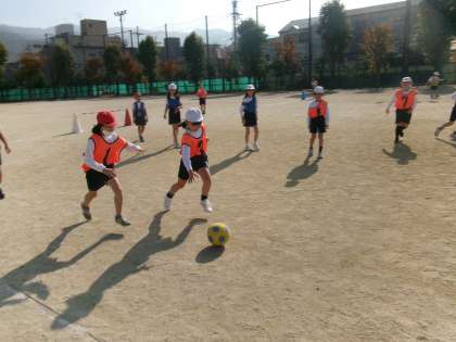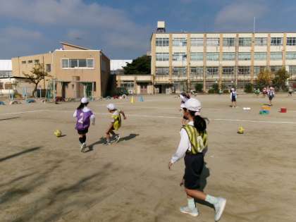 体育で、サッカーの学習をしています。1人ではなかなか難しい種目ですので、チームで協力しながら取り組んでいます。みんなでレベルアップしていきたいです。