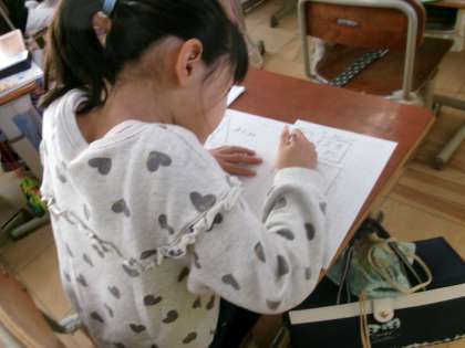 今日は、いろいろな大きさの三角形や四角形をかくことに挑戦しました。学習が進む中でずいぶん慣れてきたようで、上手にかくことができていました。