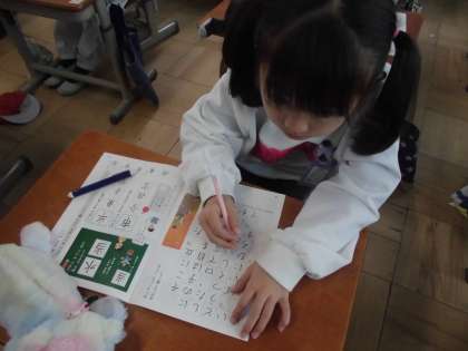 1組では、書写の時間に文字の中心に気をつけて書く練習をしました。じっくり丁寧にお手本をなぞっていました。