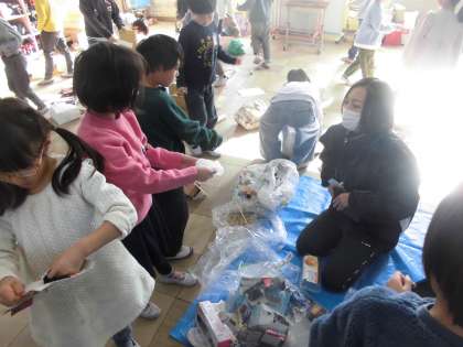 1組では、生活科でおもちゃ作りに使った材料の片づけをしました。紙やプラスチックなど、先生に確認しながら分別も頑張っていました。