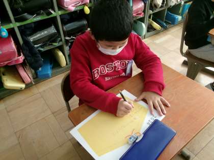 2組では、今年がんばりたいことを絵馬に書いていました。「字をきれいに書きたい」や「テストで100点をとりたい」など様々な願いが込められていました。