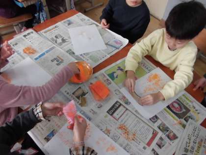 今日の図工では、図工室でローラーを使った台紙作り、そして教室でスタンプの練習をしました。