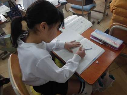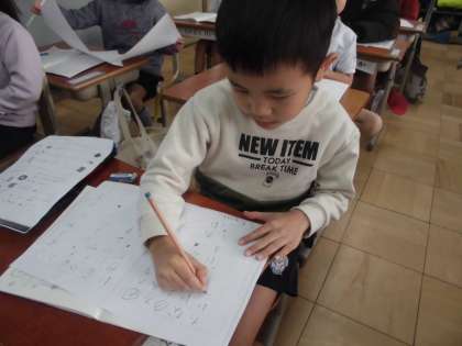 今日は、言葉を増やすことば遊びをしました。「たい」の後に「こ」を足して「たいこ」のように一文字増やしてことばを作ったあとは二文字増やしにも挑戦していました。たくさん言葉を見つけてノートに書いていました。