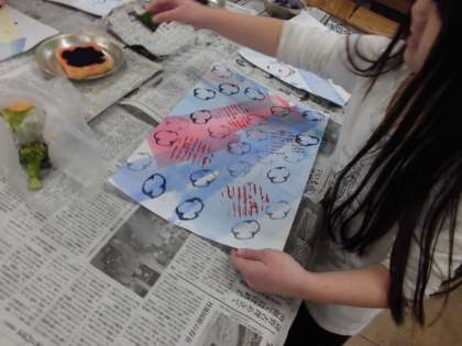家から持ってきたものや、学校にあるものをためしにスタンプして、本番用の台紙にどううつすのか考えてから、台紙にスタンプしていきました。
