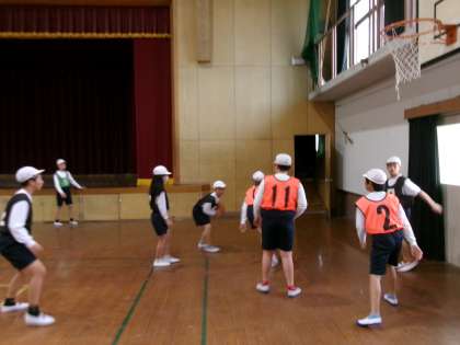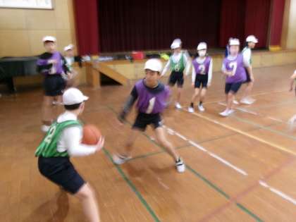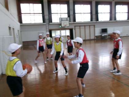 体育でバスケットボールの学習をしています。ボールの扱いに慣れ、白熱したゲームをくり広げています。