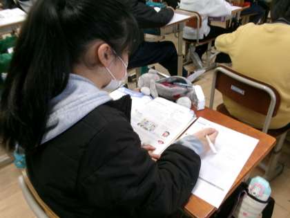 家庭科で、冬の住まい方や着方にの特徴や工夫について学習しています。夏にも同じような学習をしているので、その時の学習を思い出しながら冬の生活の工夫を考えています。上手な工夫の仕方を学んで寒い時季を乗り越えていってほしいです。