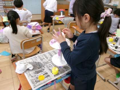 かみ皿を使って作品作りに取り組んでいます。自分のイメージに合うように工夫しながらがんばっています。みんな楽しそうに作っている姿が可愛らしいです。
