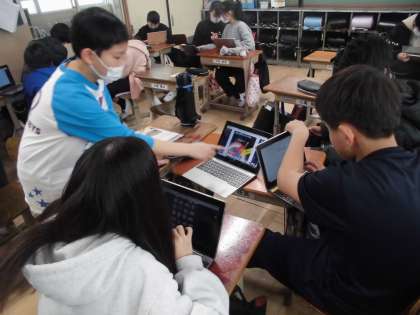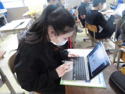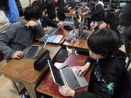 生物と地球環境の単元では、「地球環境ととのように関わっていけばよいのか」をテーマに、人の生活と地球環境との関わりをインターネットや本を使って調べています。班で協力して、ロイロノートやパワーポイントにまとめていっています。