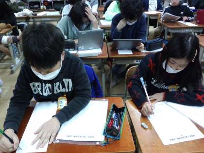優しい町を広めるべく、標語つくりをしました。国語科の詩の単元で学習したように、一度作ってみてから違う言い回しはないか、もっとよく伝わる表現はないか、GIGA端末で調べたり、友だちに聞いたりしながら作っています。