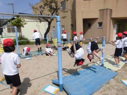 総合遊具の使い方を再度学習し、鉄棒あそびをしました。