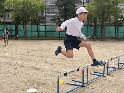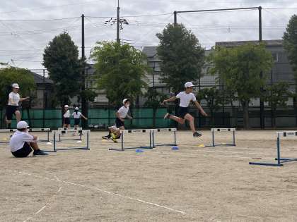 体育科の学習では、ハードル走を行っています。少しでも記録が良くなるように、友達の見本を見たり、お互いにアドバイスをし合ったりして、学習に取り組んでいます。友達と協力して、良い記録を出せるように取り組んでいってほしいです。