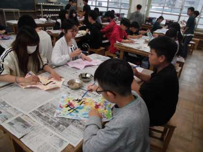 絵の具でつくったデザインの上に筆で文字をかき、1つの作品に仕上げました。それぞれの思いのこもった素敵な作品に仕上がりました。出来上がった作品をクラスのみんなで鑑賞もしていきたいです。