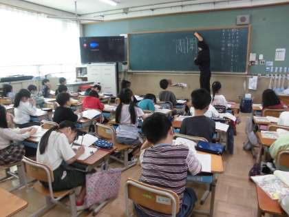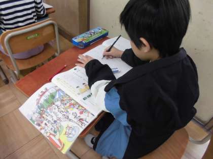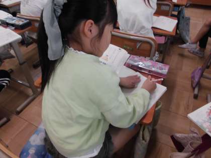 国語で、大事なことを落とさないように聞くという学習をしています。自分が聞きたいことを落とさないように、集中して聞きながらがんばっていました。