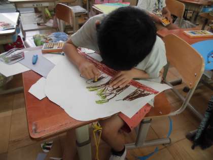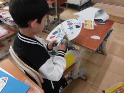 図工でふしぎなたまご作りに取り組んでいます。今日は、色画用紙に自分のイメージするオリジナルのたまごをデザインして作成しました。