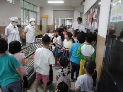 給食室はクラスごとに見せてもらいました。家とは違う、大きなお鍋、たくさんのじゃがいもやキャベツ、お肉などがありました。たった4人で小学校みんなの給食を作っていることに驚いていました。