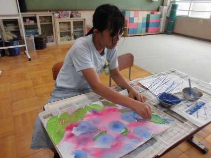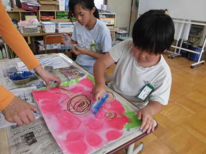 図工の作品作りがんばっています。描いた絵にものさしと絵の具を使って雨を降らしてみました。ドキドキしながら慎重に塗っていました。