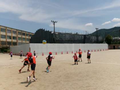 体育では、エンドボールの学習が始まりました。チームで協力し、ボールを回して、ゴールマンにパスをつなぎます。どのようにすれば、上手にパスができるか考えながら学習を進めていきます。