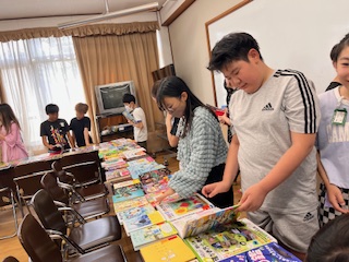 図書室に置いてほしいと思う本を1人1冊選びました。それぞれ本を手に取りながらどれにしようか真剣に悩む姿が見られました。