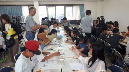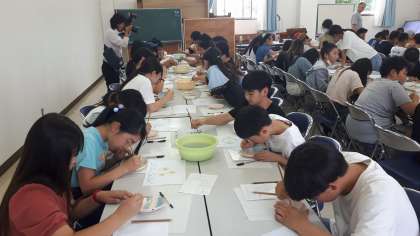 茶碗グループ、小皿グループ、湯飲みグループに分かれて活動開始です。鉛筆で下書きを行い、色をつけていきます。事前にスケッチした用紙をもとに色をつけ、絵付け完成です。作品はこのあと焼く作業になります。後日学校に届きます。