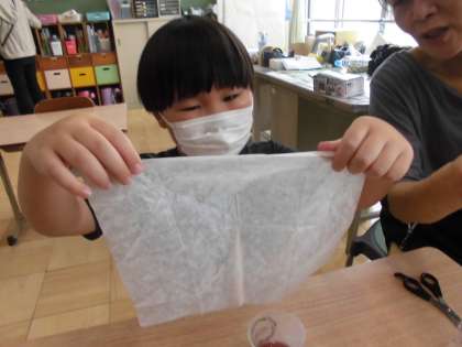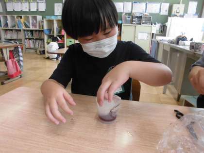 1年生は育てたアサガオの花びらを絞って、色水作りをしました。水の加減が難しく少し薄めにはなりましたが、楽しく取り組むことができました。