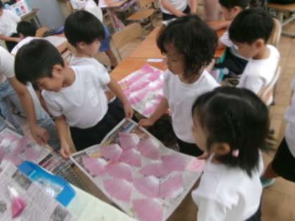 これから染紙を使ってあさがおの花を作っていきます。どんな仕上がりになるかお楽しみです!!