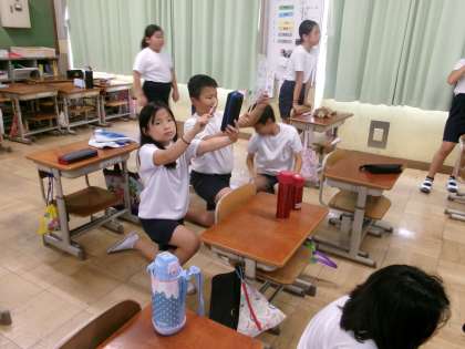 振り付けを覚えるために、今日は教室でテレビを見ながらの練習です。