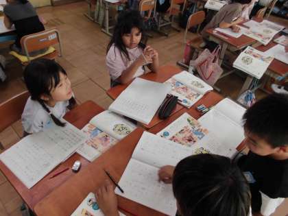 小学校の様々な場面の絵に合った漢字を使って、文を作りました。