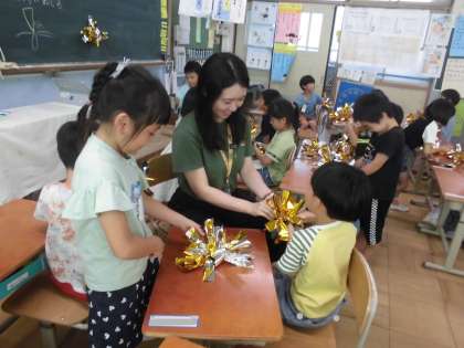 運動会に向けて準備をがんばっています。今日は、本番で使う飾りの準備をしました。きれいな色の飾りにみんな心をワクワクさせていました。本番が楽しみです!