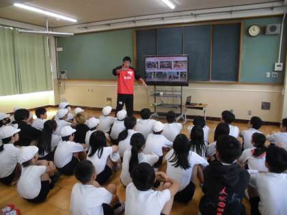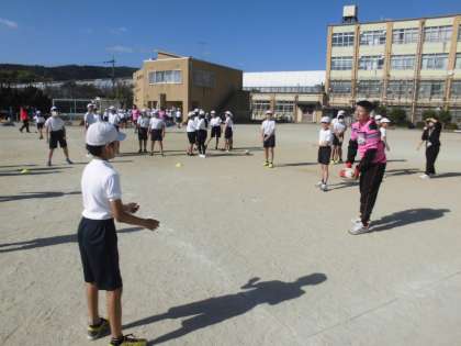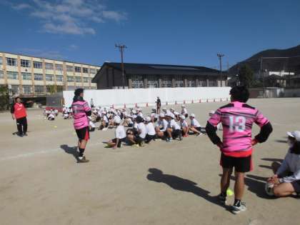 今年度も企業のラグビー部の方々がきて下さり、体験教室を行うことができました。最初に教室で自己紹介や取組の説明をしてもらい、その後、運動場に出てボールを使ってゲームなどを行いました。
