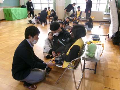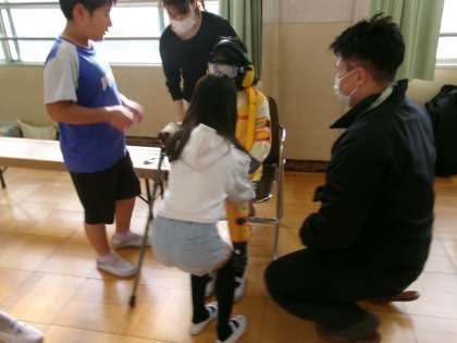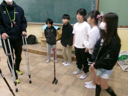 車いすや歩行器、杖などを使う体験や器具をつけての高齢者体験を行いました。