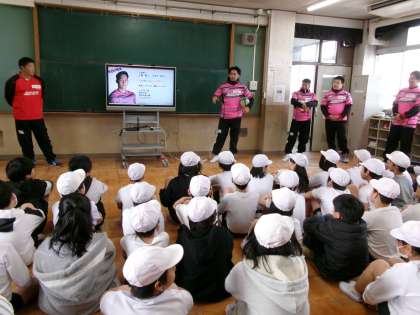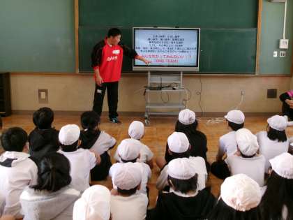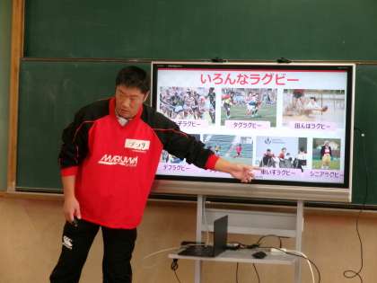 社会人でラグビーをされている選手の皆さんをゲストティーチャーとしてお招きして、ラグビーについて教えていただきました。