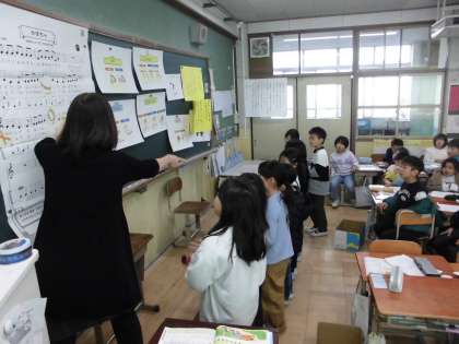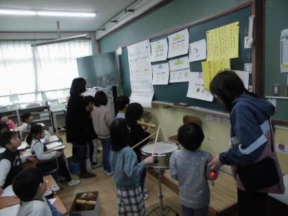 『かぼちゃ』の歌に合わせて、いろいろな楽器を鳴らしました。