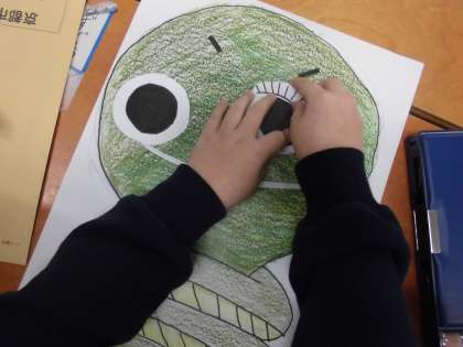 グルーごとに、高学年が作ってくれた福笑いをしましたが、目隠しをして顔のパーツを並べるのは、なかなか難しかったようです。