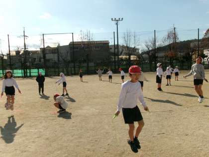 体育では、持久走記録会に向けて、ペース走の学習が始まりました。まだ、練習したばかりなので、走る距離は本番よりも短いのですが、少しでも記録を伸ばそうと一生懸命走っています。走る前にはなわとびをして、体を温めています。自分のできる跳び方で、できるだけ跳び続けようと頑張っています。なわとびは、休み時間も友だちと楽しみながら練習している姿が見られます。
