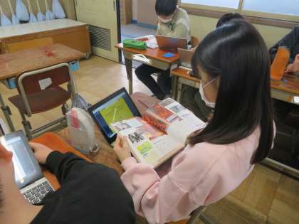 社会科の学習で、戦争は社会や人々のくらしのどのような影響を与えたのかを学習しています。その日の学習内容を個人で決め、ロイロノートでまとめています。まとめたものを友達と交流することで理解を深めています。