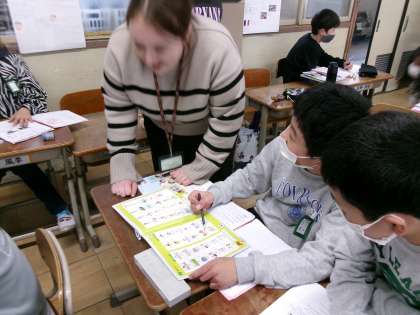 今日の外国語は、ALTのギボンズ先生が来てくれました。今6年生では、学校生活で一番の思い出を英語でスピーチする活動に取り組んでいます。今まで学んできたことを活用して英語の文章を考え、書き、発音しています。ギボンズ先生に、発音が正しいか聞いてもらう子や、スペルが正しいか質問する子、中には、「see」と「watch」の違いを尋ねる子もいました。中学生になっても、好奇心をもって英語に取り組んでほしいと思います。