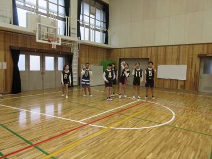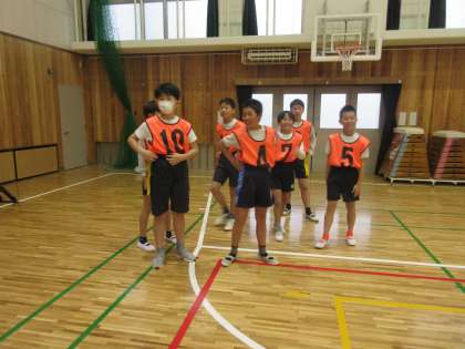 文化部に続いて、体育館で行われたのは、「タグラグビー部」の6年生との交流会です。先生チームも入って子どもたちのチームと3つの競技で競い合いました。