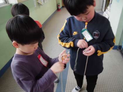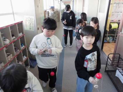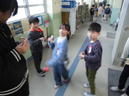 今日はあいにくの雨…でも1年生は、雨の日限定で昔遊びの道具を休み時間に使ってもよいことになっているそうで、わかば学級のみんなも一緒に遊ばせてもらいました。
