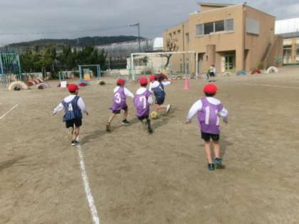 「ボールをよく見て蹴ったらシュートが入ったよ。」「パスをもらう時に、相手チームがいない場所に動くといいよ。」など、しっかり考えてプレーしている様子も見られます。