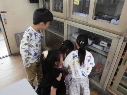生活科の学習で、校内のことについて調べています。今日は理科室にいってみました。初めて見る理科室に、みんな興味津々で見入っていました。