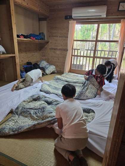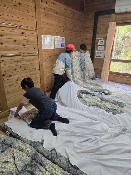 シーツをもらって就寝準備をします。みんなで協力して準備です。靴もきれいにそろっています。