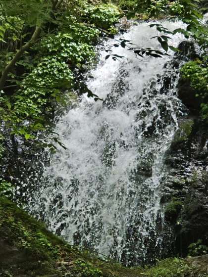 安全に気をつけて一列に並んで歩き、再び山道を登り滝に到着しました。透き通った水が流れている滝でした。