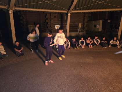 遠き山に日は落ちてをハミングで歌い、火の神様と火の子どもたちによって誓いの火がつけられました。