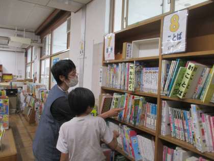 国語科の時間に図書館に行きました。5年生は図書館の本の分類について学校司書の先生に教えてもらいました。その後、「せんろはつづく」の本を読み聞かせしてもらいました。山にトンネルを掘ったり、橋に鉄橋を架けたりしてどんどん線路がつながっていきました。
