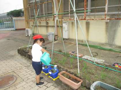 今朝畑に水やりに行くと、ナスやピーマンの小さな実ができていました。1年生のまいた朝顔の種からも芽が出ていました。これから大きく成長していくのが楽しみです。