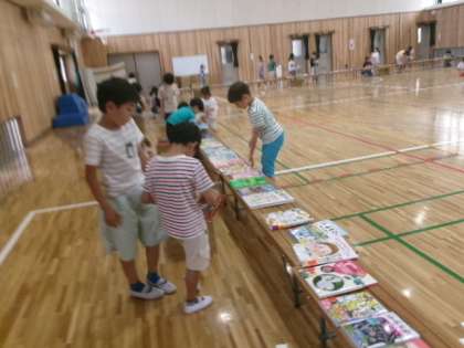 書店さんが、体育館の長椅子の上に本を並べてくれて、子ども達は、自分が小野小の図書館においてほしい本を一人一冊選びます。