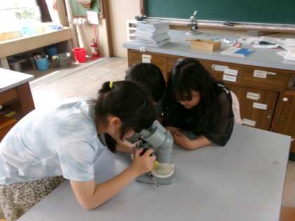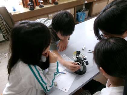 理科の学習では、顕微鏡を使ってメダカの卵の観察をしました。採取した日ごとに観察することで卵がどのように変化していくのかを観察することができました。上手にピントが合うと、卵の中のメダカの動きまで見ることができ、とても驚いていました。